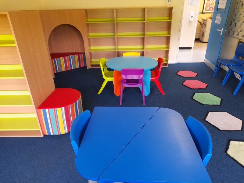 The installation process which took place in July 2021 created a multifunctional room with areas for group work, comfortable seating, and a corner reading den for quiet reading.